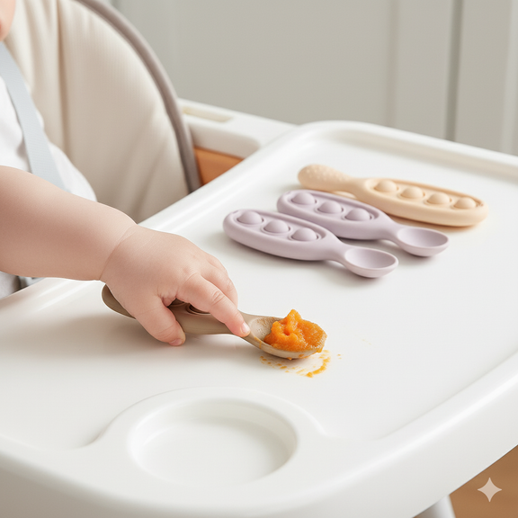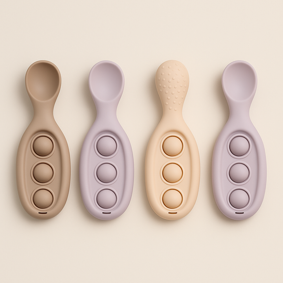 Our Soothing Silicone Spoon Set is thoughtfully crafted to make every mealtime calm and joyful. Each spoon is made from 100% food-grade silicone—soft, safe, and perfect for teething gums. The easy-grip design encourages independent feeding, while the built-in sensory bubbles add a fun tactile experience to keep little bubb engaged.